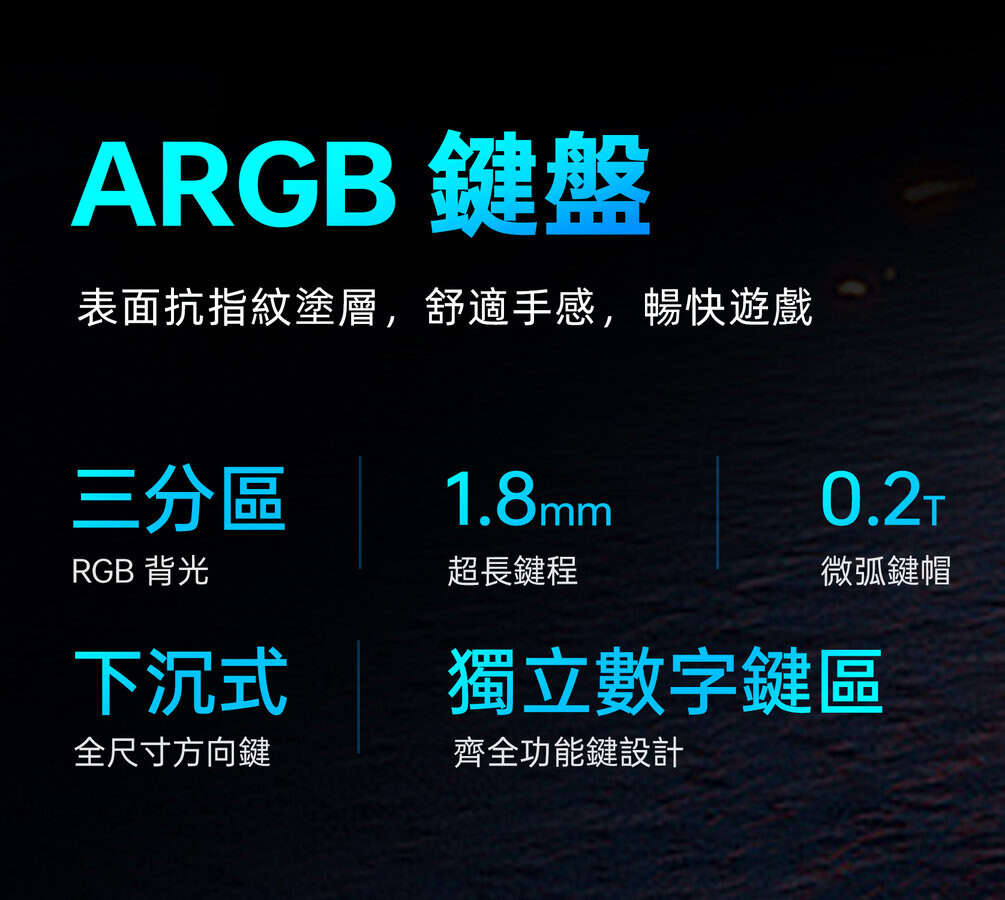 鍵盤採用下沉式的全尺寸的方向鍵及擁有獨立的數字鍵區,按鍵使用 1.8mm 超長鍵程、0.2T 微弧鍵帽、抗指紋圖層表面及三分區 RGB 背光燈效,同時將電源鍵獨立於鍵盤之外,避免誤觸的尷尬情況。