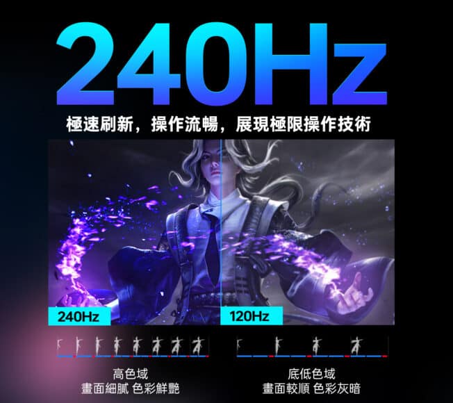 顯示螢幕採用京東方的 16 吋 IPS 面板,搭配筆電的黃金 16:10 顯示比例、2K 2560×1600 超清解像度、240Hz 極速刷新率、100% sRGB 色域及 DC 調光功能,呈現細膩、超高清、真實及流暢的視覺體驗,同時也避免長時間使用產生的眼睛疲勞。