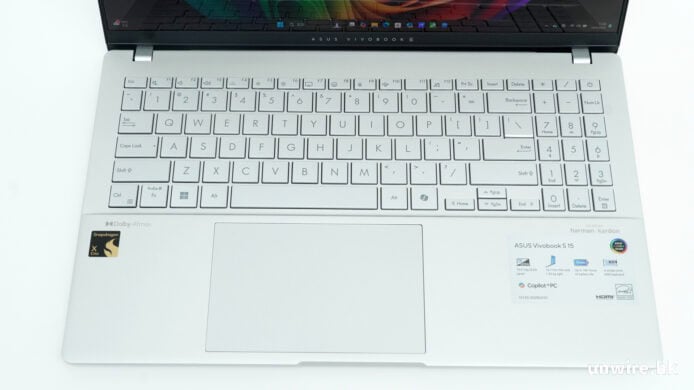 至於操控介面方面,Vivobook S 15 內建了全尺寸的鍵盤佈局,亦內建了數字鍵盤,方便需要輸入大量數字的用家使用。按鍵按打面積足夠,而且有一定鍵程,筆者試過長時間打字仍算舒服。一如以往,Vivobook S 15 的鍵盤仍設有大量功能鍵,當然不能少的是它新增了 CoPilot 專屬按鍵,一按即可開啟 Microsoft Windows 的 CoPilot AI 功能操作系統或查詢資料,操控上十分方便。至於觸控板方面,不算十分大,但要進行多手指操控仍然十分輕鬆,而且「剛剛好」的觸控板面積,亦令大家打字時手腕不會誤觸,使用上體驗取得十分理想的平衡,這是值得一讚的地方。