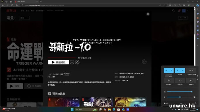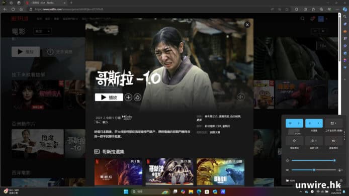 ▲筆者亦初步測試過 Vivobook S 15 的電量,筆者將熒幕亮度調至 100%、音量調至 50% 的情況下,透過 Wi-Fi 連接上網並以串流模式全熒幕顯示播放 Netflix 的《哥斯拉 -1.0》電影,在經過長達 2 小時左右的播放後,電量只是由 100% 跌至 81%,只是耗用了 19%。以此推算,如果要連續播放影片,Vivobook S 15 應可支援播放長達 10.5 小時,以如此大熒幕的筆電而言算是十分「長氣」,要用足一日以上基本問題不大。