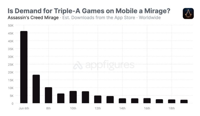 根據 MobileGamer.biz 提供的 Appfigures 報告,移動裝置用戶對 AAA 遊戲的需求並非如預期的那樣高。Appfigures 報告顯示《刺客教條:幻象》自 6 月 6 日推出以來,總下載量已經達到 123000 次,但截至上星期只有不到 3000 人購買了整個遊戲。差不多同時期推出的原生手遊《刺客教條:起義》有接近 200 萬次下載,比《刺客教條:幻象》高出 612%。其他 AAA 大作也是同樣情況,Capcom 的《生化危機 4》和《生化危機 村莊》完整購買了遊戲的分別只得 7000 份和 5750 份。