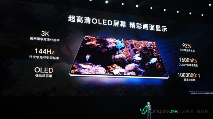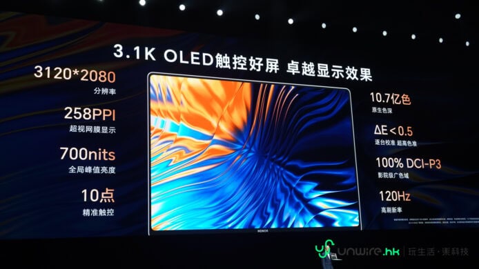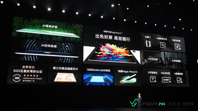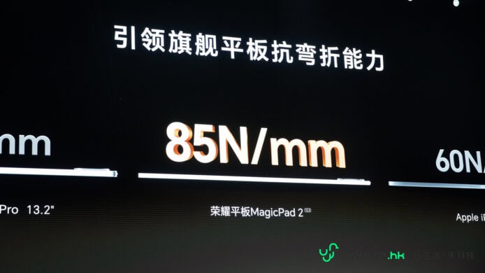 除了 MagicBook Art 14 這部設計精美的輕薄型筆電外,Honor 同場亦發佈了全新的平板電腦 MagicPad 2 12.3”,顧名思義它內建了 12.3 吋熒幕,並採用了 OLED 材質,擁有 3K 解析度及 144Hz 更新率,亦擁有 1600 尼特峰值亮度,表現十分理想,而且它支援 4320Hz 零風險調光,亦與 Magic V3 一樣支援 AI 離焦護眼技術,長時間瀏覽仍可保護雙眼健康。