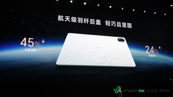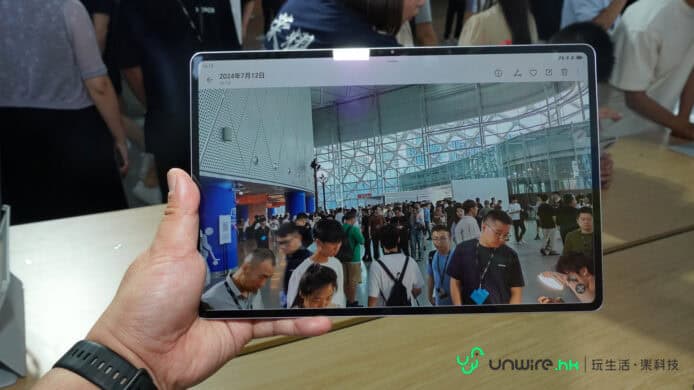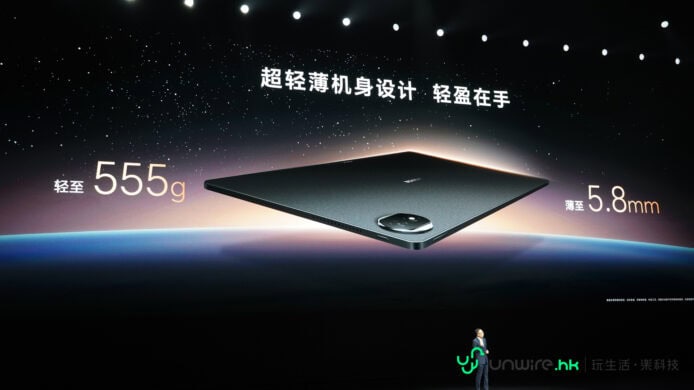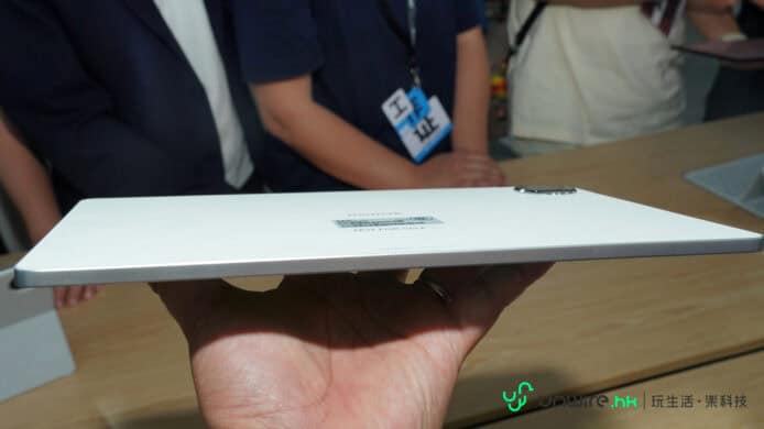 另外,它的機身最薄位置只有 5.8mm 厚,重量亦只有約 555g,十分輕薄,而且採用了航天級羽纖後蓋物料,不但有效減輕機身重量,亦令硬淨度比上代提升了 24%,外攜使用時既輕巧又不用擔心易壞。音效方面,它內建了八聲道喇叭,亦支援空間音效及增強低音效果,而且透過 AI 更可模擬音源方向,令用家可以擁有猶如親臨現場欣賞的聽感,而且它的 AI 空間計算更可增加體驗距離,官方表示即使將平板放在檯面,然後躺在梳化上,亦可以欣賞到不錯音效。
