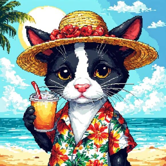 以可愛的卡通風格生成一張圖片。圖片內容是一隻頭戴草帽,身穿夏威夷襯衫的黑白奶牛貓,背景是陽光與海灘,貓貓以人立姿態站着,手上拿著一杯珍珠奶茶。