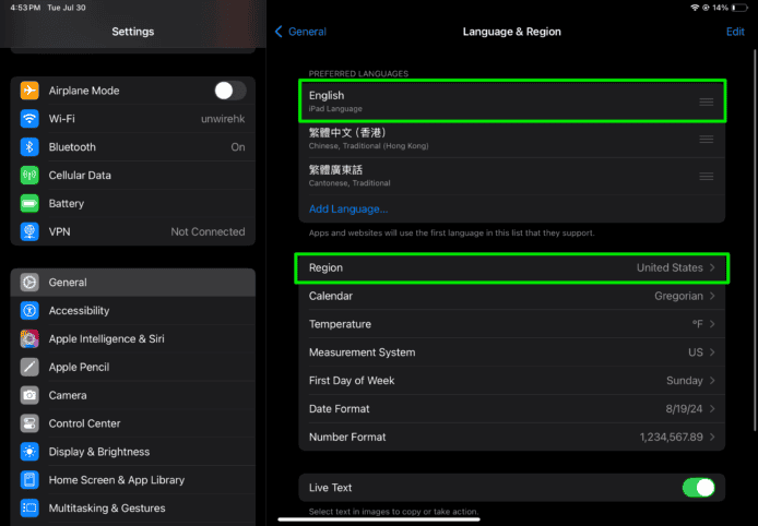 目前 Apple Intelligence 對測試參與者有一定限制,為了符合 Apple 方面的限制,iPhone/iPad 語言、地區設定就要作出一點更動。