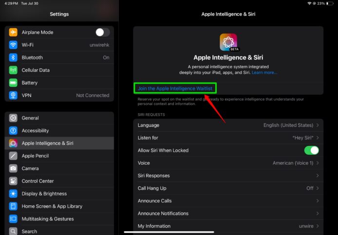 此時再進入設定,選擇「Apple Intelligence & Siri」,你就會看見「Join The Apple Intelligence Waitlist」即可排隊輪候。小編實測過,實際上輪候約半小時就可以開始試玩。