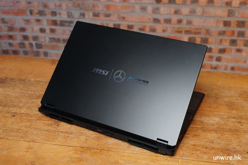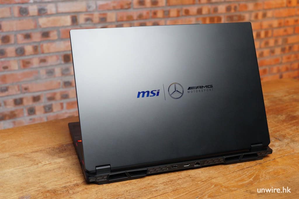 機身細節包括手托處的大面積 AMG 圖騰,底部的 MSI 與 Mercedes-AMG 簽名金屬銘版,以及筆電背蓋、螢幕邊框與底部的 Mercedes-AMG Motorsport 標誌。