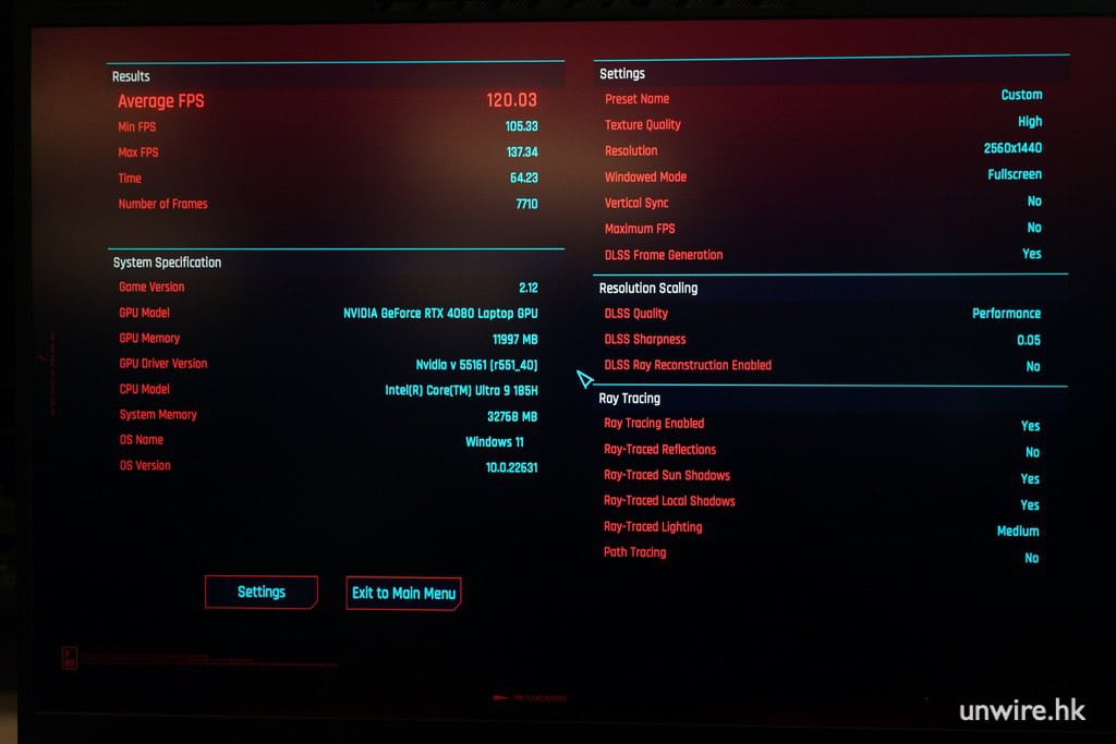 ▲想要極致流暢度的朋友,可切換至 2K 顯示,畫面幀率可達 120.03fps,兼享受光線追蹤效果