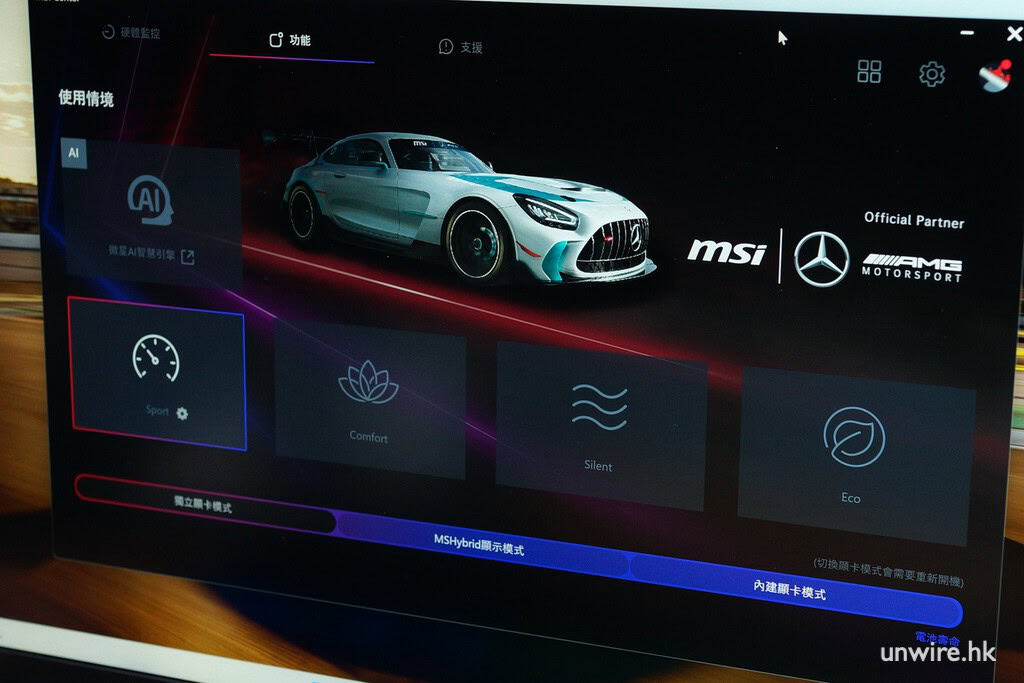 ▲在主控台程式中,可調節 AI 智慧引擎,或直接開「Sport」模式全速運作
