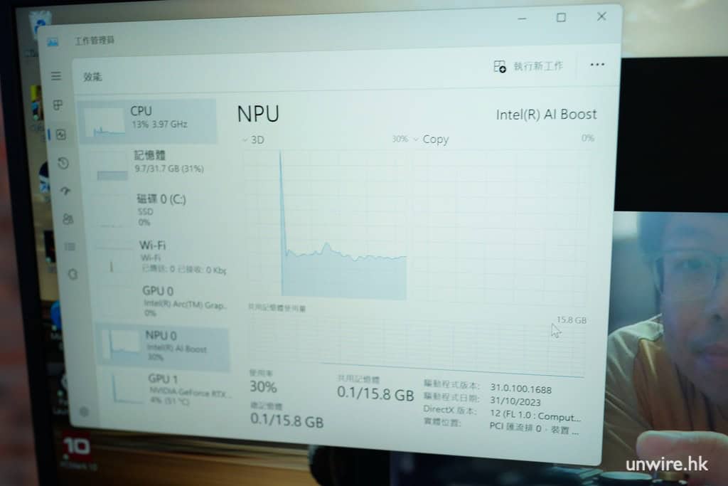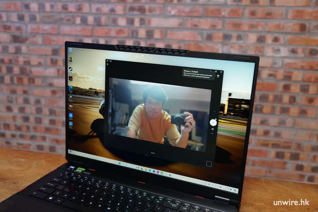 內置 AI 處理單元 NPU (Neural Processing Unit) 的 Intel Core Ultra 9 185H 處理器,可讓用戶輕鬆處理日常 AI 應用。透過 Windows 內置的「Studio 效果」,相機可引入透過人工智能運算的背景模糊化效果、鏡頭主動追蹤用家,並拍攝出最佳構圖,它可適用於 Windows 內絕大部份常用網絡會議軟件,如 Zoom、Microsoft Teams 等。你可看到這些功能運作時,「工作管理員」顯示出 NPU 有發揮其運算功能,這可令到 CPU、GPU 有更多資源去同時做更多工作,大大增強效率。