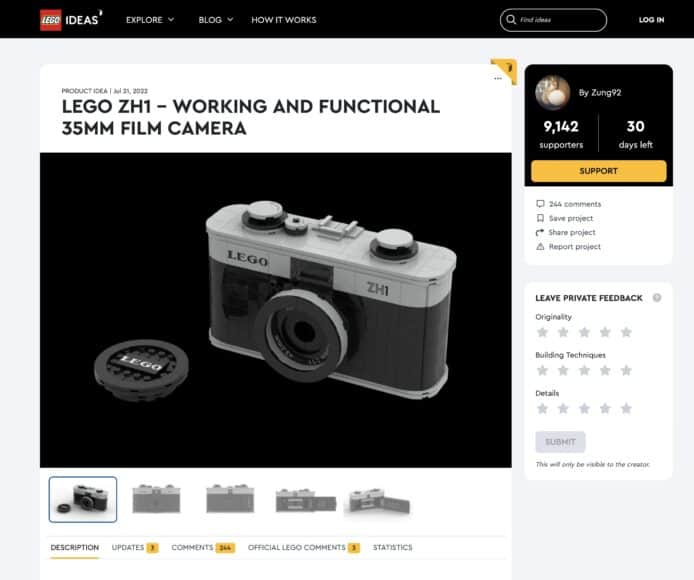 目前樂高 LEGO ZH1 相機專案目前已有 9,142 名支持者。目標是 10,000 名支持者,因此還差 858 名支持者才能達到目標,進入下一個「Expert Review」專家評審階段。(專案頁面連結)