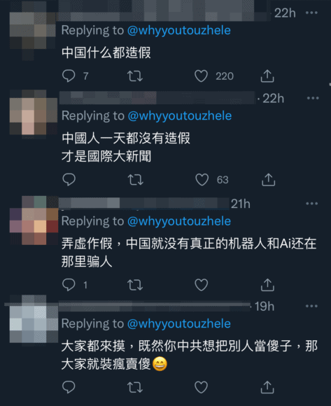 此外,亦有影片亦拍到「女機械人」食飯及有職員幫手抺汗、吹風扇的畫面。影片公開後隨即引起網民熱議,指「中國甚麼都造假」、「中國人一天沒造假才是國際大新聞」、「弄虛作假,中國就沒有真正的機械人和 AI 還在那裡騙人」、「大家都來摸,既然你中共想把別人當傻子,那大家就裝瘋賣傻」。