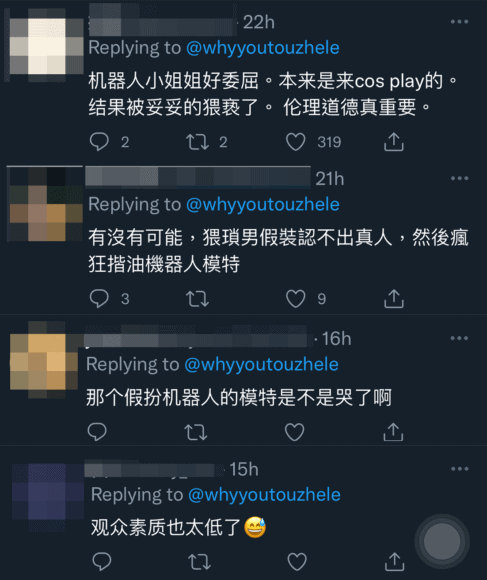 另有網民替「女機械人」抱打不平,「機械人小姐好委屈,本來是來cos play的,結果被妥妥的猥褻了,倫理道德真重要」、「有沒有可能,猥瑣男假裝認不出真人,然後瘋狂揩油機械人模特」、「那個假扮機械人的模特兒是不是哭了啊」、「觀眾質素也太低了」。