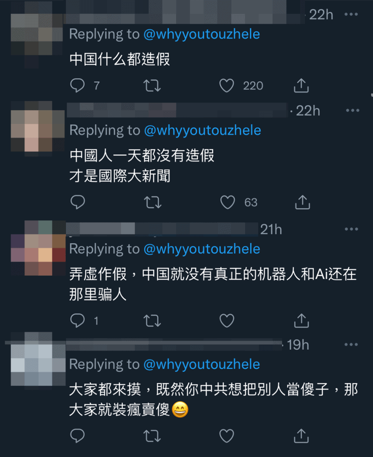 此外,亦有影片亦拍到「女機械人」食飯及有職員幫手抺汗、吹風扇的畫面。影片公開後隨即引起網民熱議,指「中國甚麼都造假」、「中國人一天沒造假才是國際大新聞」、「弄虛作假,中國就沒有真正的機械人和 AI 還在那裡騙人」、「大家都來摸,既然你中共想把別人當傻子,那大家就裝瘋賣傻」。