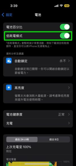 ▲開始測試前電量為 100%,「低耗電模式」設定為開(見綠框)