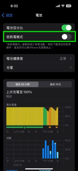 ▲開始測試前電量為 100%,「低耗電模式」設定為關(見綠框)