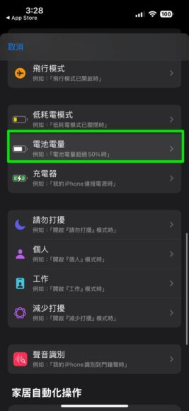 現在開啟「捷徑」應用程式,選擇「自動化」,點擊「新增自動化操作」後選擇「電池電量」,然後按照個人需求設定何時自動啟用「低耗電模式」。小編設定「低於 35%」就會自動啟動「低耗電模式」,儘量避免 iPhone 電池下降至 20% 以下。