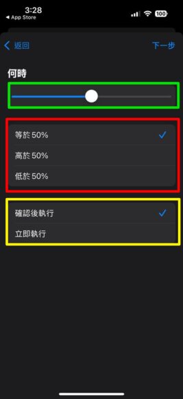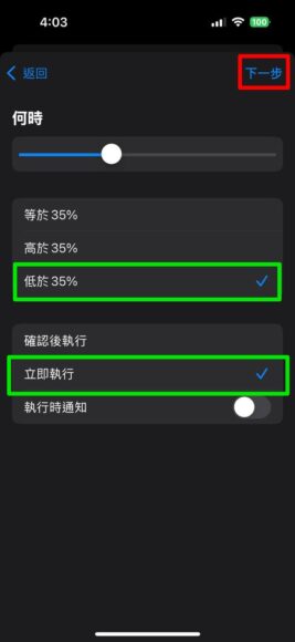 ▲小編設定為「低於 35%」及「立即執行」,「執行時通知」為關(見綠框),