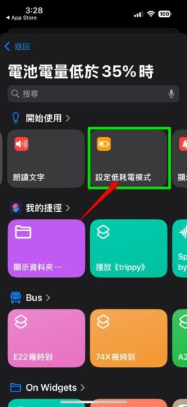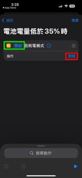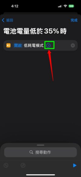 選擇「設定低耗電模式」,然後檢查設定是否為「開啟」,檢查設定正確無誤後可點擊「完成」,以儲存「自動切換『低耗電模式』」捷徑。