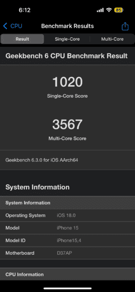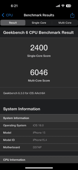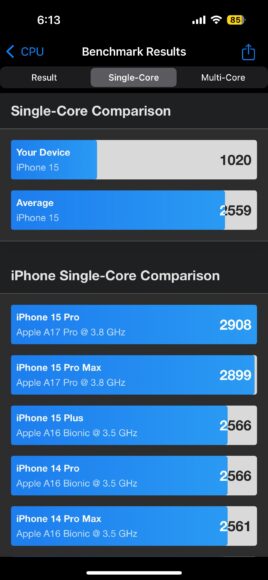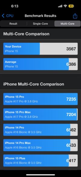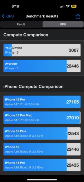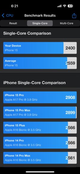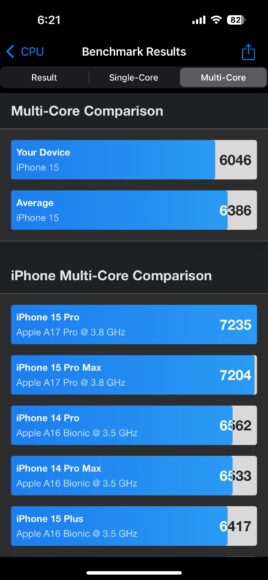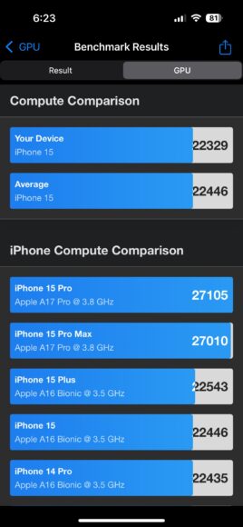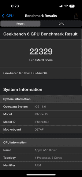 一般 iPhone 15 在 CPU 測試單核的情況應該為 2559 分,多核為 6386 分,小編手上的 iPhone 15 在正常模式(即關閉「低耗電模式」)下單核跑分有 2400 分,多核有 6046 分,與 Geekbench 6 提供的一般 iPhone 15 參考數據相若;GPU 方面表現亦同樣,一般 iPhone 15 會有 22446 分,小編手上的 iPhone 15 得分為 22329,與普通 iPhone 15 差不多。