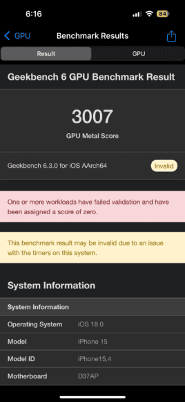 開啟了「低耗電模式」的 iPhone 15 單核跑分僅有 1020 分,多核只得 3567 分;GPU 方面表現就更加差了,一般 iPhone 15 會有 22446 分,開啟了「低耗電模式」的 iPhone 15 僅得 3007 分。