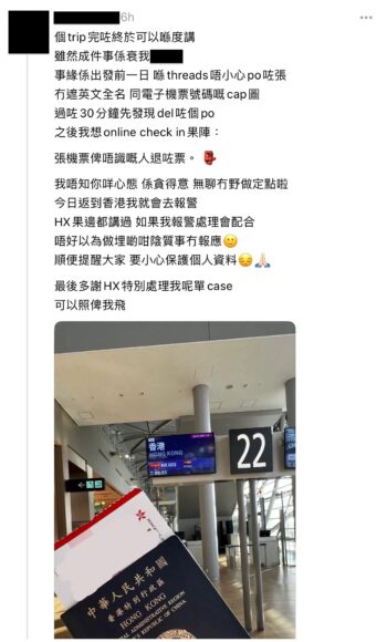 早前一名港人在旅程出發前一日將自己的電子機票上傳至社交平台 Threads 上打卡,但未有將自己英文全名和電子機票號碼遮上。事主在 30 分鐘後才發現並將帖文刪除,但後來在網上預先辦理登機手續時才得知自己的機票被不認識的人取消。