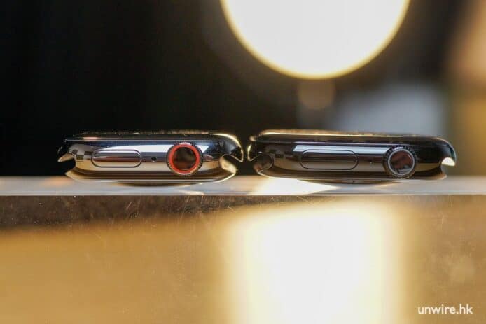 ▲對比 Apple Watch S9(左)與最新款 Apple Watch S10(右),可看到新錶錶身明顯薄得多