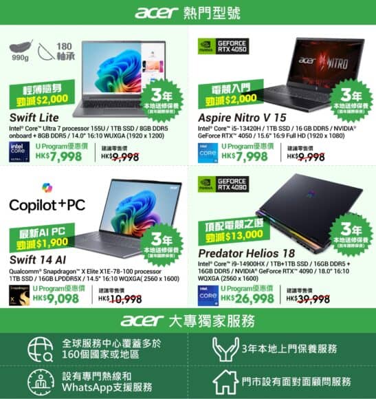 ACER 為大專院校優惠提供 23 款最新型號產品,全面升級至 3 年本地上門保養服務,並設有專門熱線和 WhatsApp 支援服務。對於在海外留學的同學,ACER 在全球擁有超過 160 個服務點,確保手提電腦在任何地方都能獲得及時的售後支援。