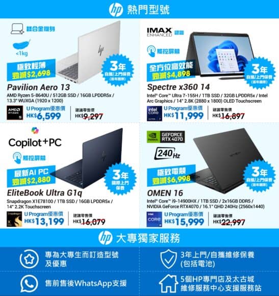 售後服務方面,HP 特設售前售後 WhatsApp 支援,全天候回應客戶查詢。全線手提電腦均提供三年上門/自攜維修保養(包括電池),再加上全港 5 間 HP 專門店和太古城維修服務中心,買得放心,用得安心。