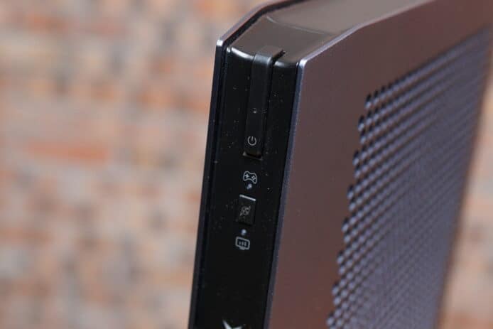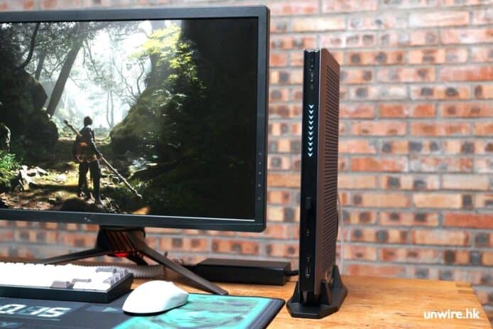 你也可放在家居客廳 PS5 旁邊,它就像一部加瘦版的 PS5,特別型格。為何聯想到 PS5,因為它們的操作按鈕設計都有幾分相似,電源開關設在機頂,而下方一個按鈕,讓你切換電腦以辦公室模式或電競模式運行。而機身的 RGB 燈號也同 PS5 很相似,屬於較為收歛的箭頭狀燈號設計,並不會像 RGB 鍵盤一樣亂閃,用家也可在電腦 App 中調節燈光亮度與閃動方式。