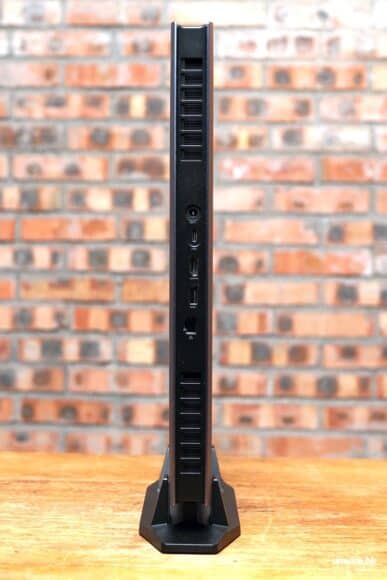 Minisforum AtomMan G7 Ti 可以說是一部「去除了熒幕的電競筆電」,內部構造設計以至所用的硬件都與一般電競筆電無異。但作為一部 Mini PC,當然在電源操作、擺放穩定性、輸入/輸出插口的使用方便程度上,會比手提電腦更適合家居使用。這部電腦只厚 3.2cm,最薄部只有 2.6cm,而底座最闊部份約 7.5cm,與一部合上的電競手提電腦非常相似,但兩面用上金屬設計的機殼,令它非常適合你放在電腦熒幕後方,與牆壁之間隙間擺放。由於它是一面吸風三面出風,所以貼牆放也不會太大影響它的散熱能力。好多朋友都想拿 Mini PC 到不同地方玩,此機重量約為 2.55kg(不連底座及變壓器),纖薄機身也便於移動。
