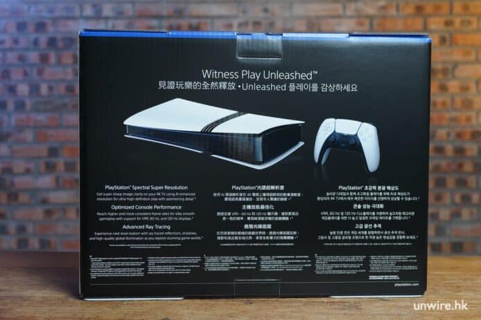 在 PS5 Pro 外箱我們已看到主機獨特的中央格柵設計,遊戲機盒背後印有 PS5 Pro 的新增效能,包括: