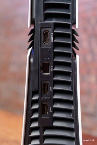PS5 Pro 機身背後可看到有更大比例的散熱口。提供 HDMI、LAN、支援 10Gbps 傳輸速度的 USB Type-A x2 插口、電源插口以及防盜線插口。PS5 Pro 同樣設有增設 SSD 的插槽,由於廠方限制,我們留待下次評測文章繼續為大家介紹。