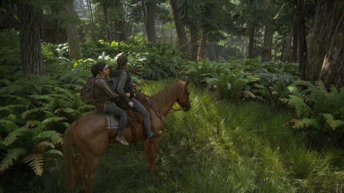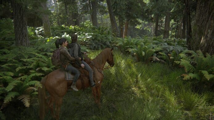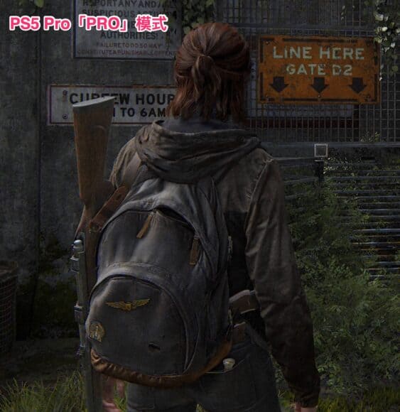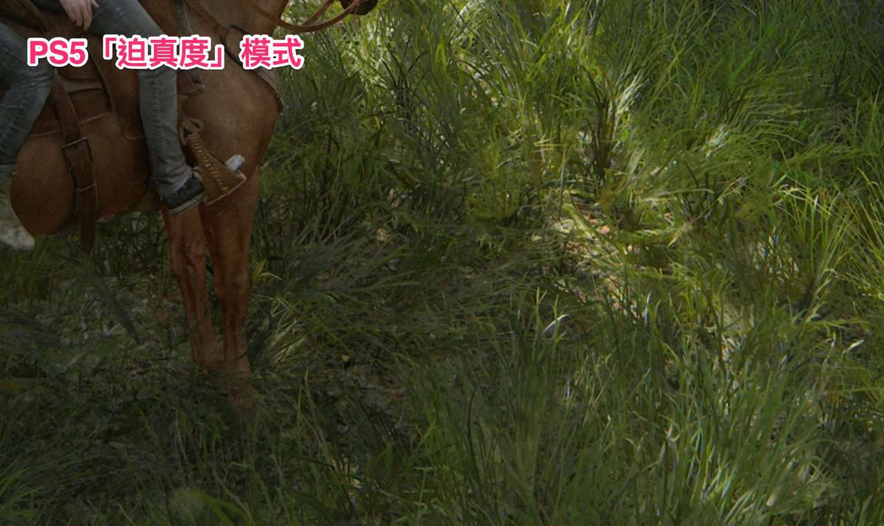 在《The Last of Us Part II》中,PS5 Pro 的「Pro 模式」將過往畫質模式的流暢度直接提升到體感 60fps。在此模式中,PS5 Pro 利用到全新 PSSR 重新將 1440p 畫面升格到 4K,我們發現畫面整體清晰度,在畫面靜止時比起 PS5 時以 4K 繪製的「逼真度」模式有可見的提升。特別是所有綠色植物如草叢、樹木、場景建築物上攀附植物的細緻度,都有看得到的提升。而且光影效果也會特別不同。有些場景的太陽光線放射會更加豐富。