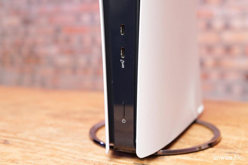 如 PS5 Slim 版一樣機身表面提供兩個 USB-C 接口,其中一個支援連接 SSD 時獲得 10Gbps 速度,另一個則可連接無線耳機或手掣的轉插頭,或者有線遊戲裝置。