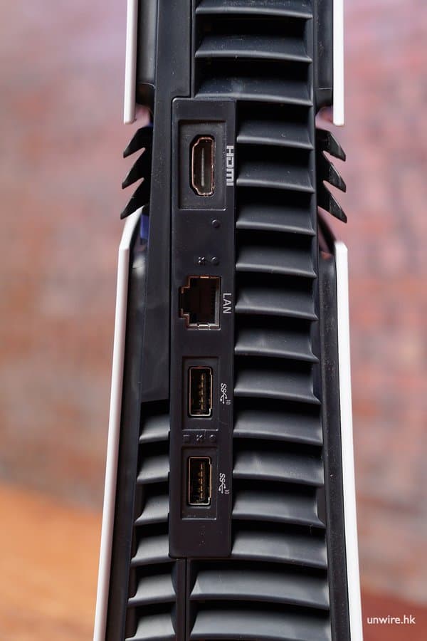 PS5 Pro 背面 USB 的排列與 PS5 Slim 版相似,同樣提供 2 個 10Gbps 傳輸速度的 USB Type-A 插口、LAN 與 HDMI 插口。