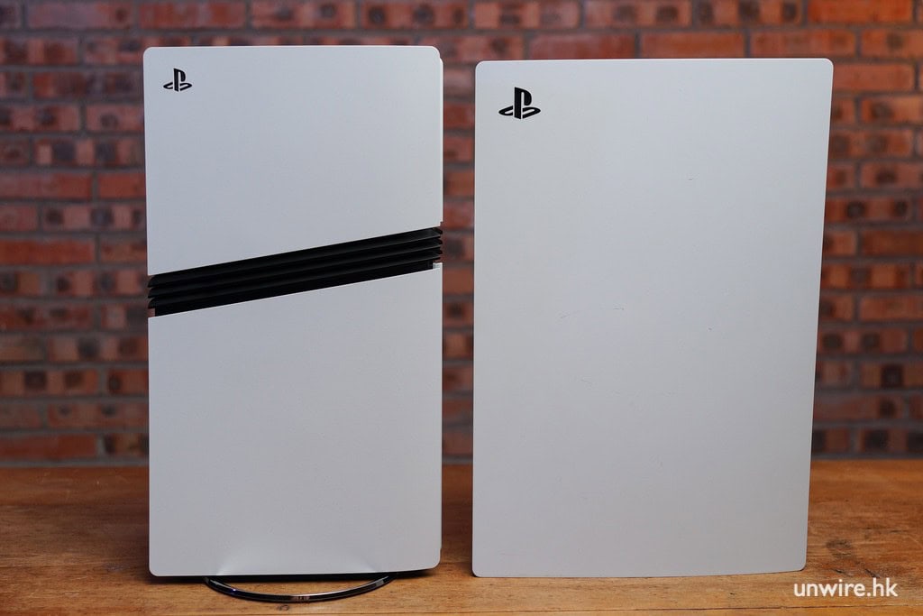 PS5 Pro 的高度與PS5基本相同,但機身闊度縮小至與 PS5 Slim一致。重量相比起 PS5 Slim 的 2.58kg,PS5 Pro 只增至 3.06 kg,如果同最初版本PS5 的 4.48kg 比較的話,PS5 Pro 就顯得十分輕盈了,適合大家四處移動或搬到朋友家打機。對比初被 PS5,PS5 Pro 整體體積卻有所縮小,雖然高度、厚度未必會有好大分別,但機身闊度上就窄了很多。