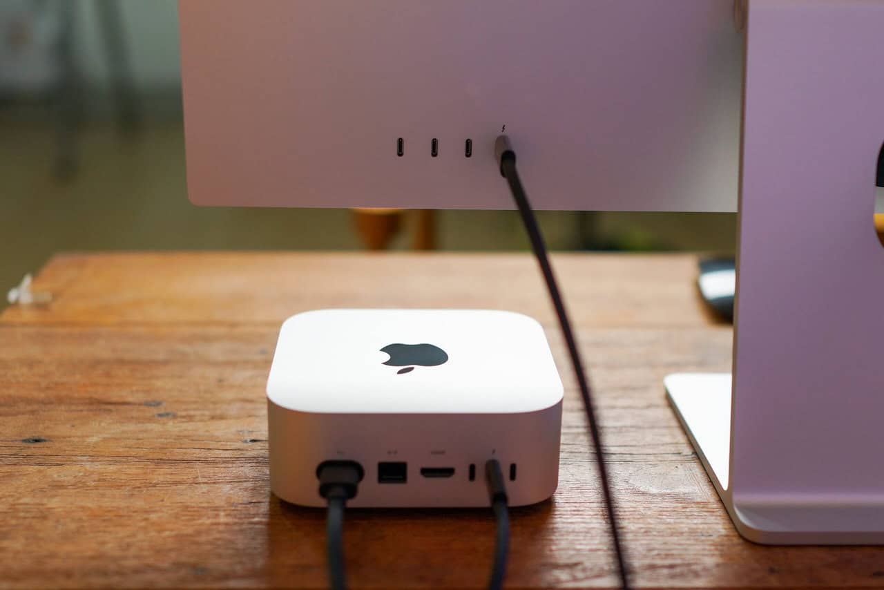 Apple 一直以來在產品設計上追求簡約優雅,Mac mini 的設計也力求簡單,它甚至將電源按鍵設置在機身底部…雖然這確是有點奇怪,你看 Mac Studio 的電源按鈕設於機背,就知它其實不是不可能的。但今次 Mac mini 設計上就同 Mac Studio 一樣極致簡約。Mac mini 以前機身扁平但其實放在桌面上都幾佔空間,今次 Mac mini 就算同 Studio Display 並排,連同機背的接線,放置於貼牆的桌面上都夠位放。Studio Display 與 Mac mini 各自有一條電線外,兩者通過一條 Thunderbolt 線就能連接起來,與繁瑣的連線告別,讓整個桌面環境更整潔有序。