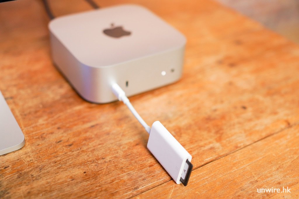 雖然不同 Mac Studio,這部 Mac mini 的機身並沒提供讀卡機,但你可自行購買 Apple 讀卡機,插上 Mac mini 機身表面的 USB-C 插孔,相片傳送速度也是很不錯。嘗試從數碼相機的 SD 記憶卡傳輸容量共有 20.13GB 的相片檔案到 Mac mini,速度只需約 1 分 16 秒。