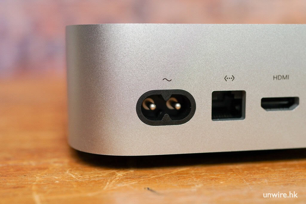 今次 5 個 USB-C 插口,背後的 3 個都是 Thunderbolt 4(M4版)或 Thunderbolt 5(M4 Pro版)插口,分別提供 40Gbps 以及 120Gbps 傳輸速度。而 Mac mini 正面兩個 USB-C 插口,則支援 USB 4,傳輸速度為 40Gbps。
