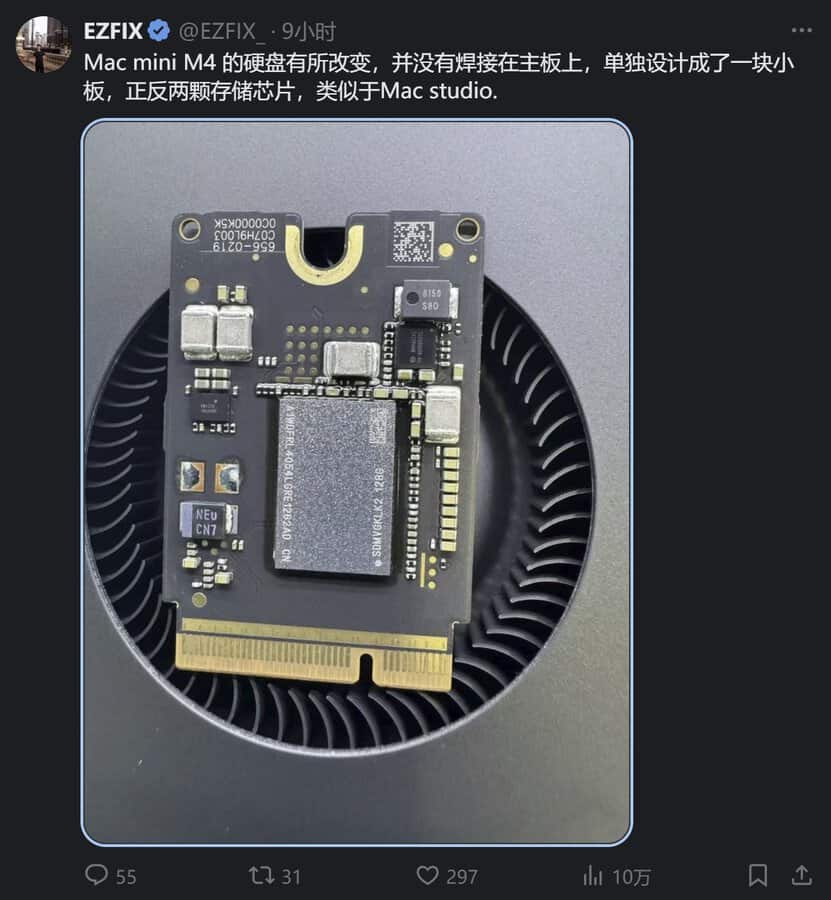 網絡上有人發表拆解影片,透視 Mac Mini M4 的 SSD 為單一可拆模組,與之前 M2 型號的焊接式儲存設計不同,其儲存控制器依然嵌入於系統晶片 (SoC) 中,限制了自主升級和維修的可能性。今次發現的 Mac Mini M4 的儲存配置類似於 Mac Studio 和 Mac Pro,但儲存控制器無法更換,個人進行 DIY 升級的空間相當有限。一段來自中國的帖文顯示,有技術人士成功將 NAND 晶片替換為容量較大的型號,提升儲存至 2TB。這說明了 Mac Mini 雖具升級潛力,但需具備專業技能,否則難以完成相關操作。