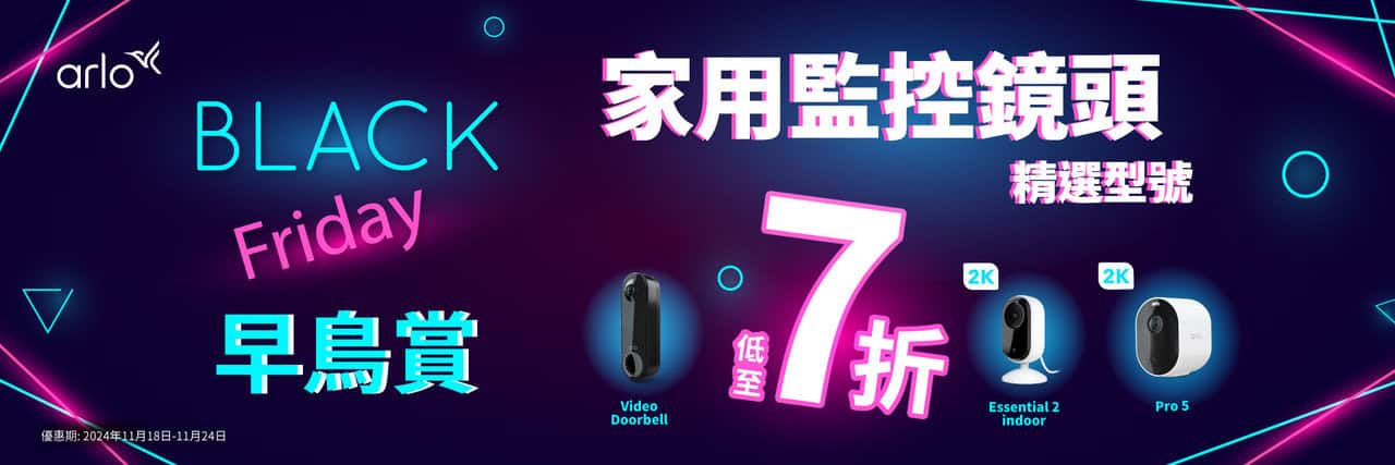 「黑色星期五」購物節即將來臨。美國無線網絡攝影機品牌 Arlo 的香港總代理永高(太平洋)有限公司將於 11 月 18 日至 11 月 24 日推出限時優惠,涵蓋 Arlo 旗下多款屢獲殊榮的智能網絡攝影機及視訊門鈴,優惠更低至 7 折!年尾開始計劃外出旅遊,掛念家中寶貝,更不能錯過這次機會,以優惠價購買家用保安鏡頭,只需透過手機 APP 即可輕鬆查看家居環境,保護您所愛的家人。以下是精選優惠產品詳情。