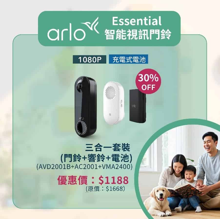 除了以上優惠,Arlo 近期亦推出了 Essential 第一代智能視訊門鈴三合一套裝。此套裝包括 Essential 第一代智能視訊門鈴、智能室內警報器,以及替換充電鋰電池。無論您身處家中或外出,均可透過 Arlo Secure App 隨時監控家門口的情況,不論是訪客、快遞員,甚至可疑人物,Arlo 門鈴的智能監控系統都能助您即時掌握,全面保障家居安全。