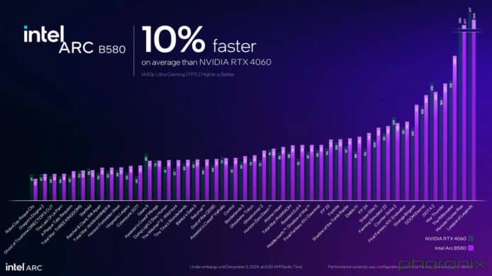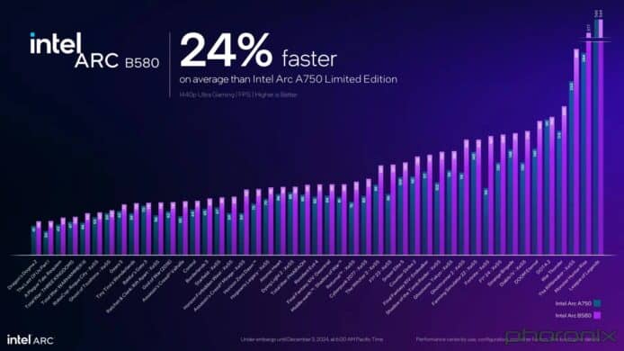 Intel 內部基於 Windows 測試結果顯示,Arc B580 比Arc A750 快 24%,與競爭對手 Nvidia GF RTX 4060 相比,則快了 10%。