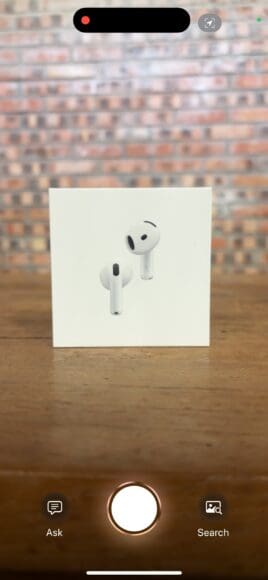 ▲Visual Intelligence 主畫面,可選擇 Ask(詢問 ChatGPT)或 Search(在 Google 搜尋相片內的物件)