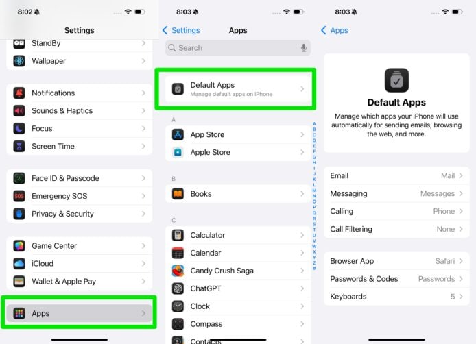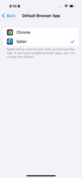 開啟設定 App,滑動至最底部,點擊「Apps」,之後選擇「Default Apps」,現在你可以自由選擇預設使用甚麼電郵、訊息、打電話、電話過濾程式,另外亦可選擇預設以 Safari 以外的瀏覽器上網,點擊連結後會自動使用你設定的 App 開啟網頁。
