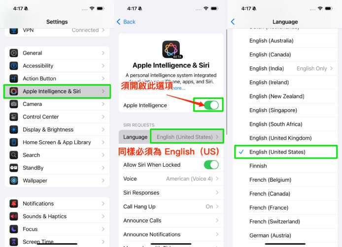 ▲確保已經開啟 Apple Intelligence 功能,而且將 Siri 語言更改為 English(US)