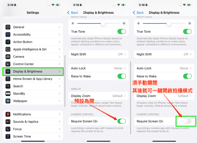 首先開啟 Setting,選擇 Display & Brightness,滑至最底後會看見「Camera Control」,預設選項為 Require Screen On,即要先喚醒 iPhone,再點擊相機控制按鍵才可開啟相機。關掉這個選項就可以隨時點擊相機控制鍵一鍵開啟相機,即時紀錄低任何精彩瞬間。