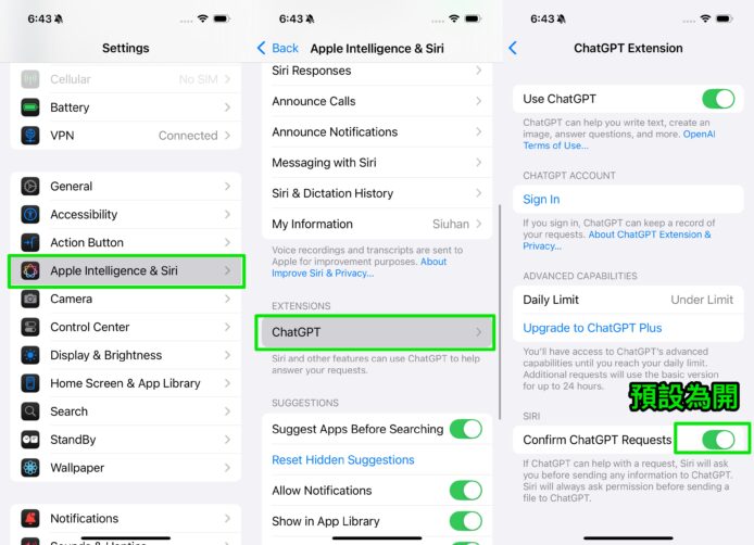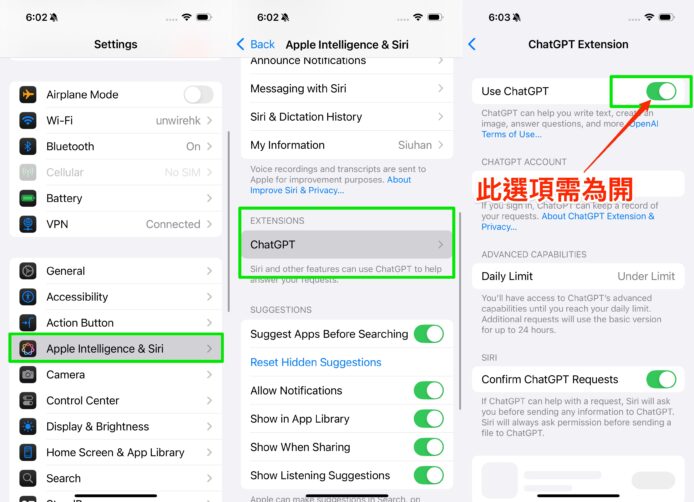 ▲需要先從 Apple Intelligence & Siri 設定開啟 ChatGPT