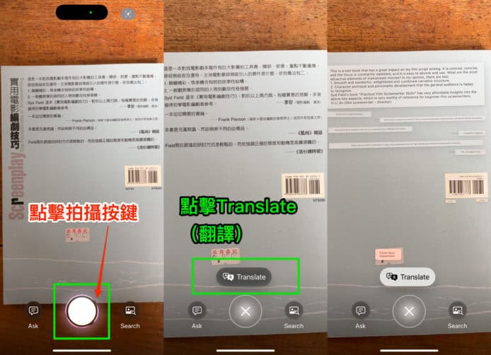 VIsual Intelligence 亦可幫你快速翻譯各種文本。首先開啟 Visual Intelligence,影低你需要翻譯的文本,然後 Visual Intelligence 會幫你將內文翻譯成英文。